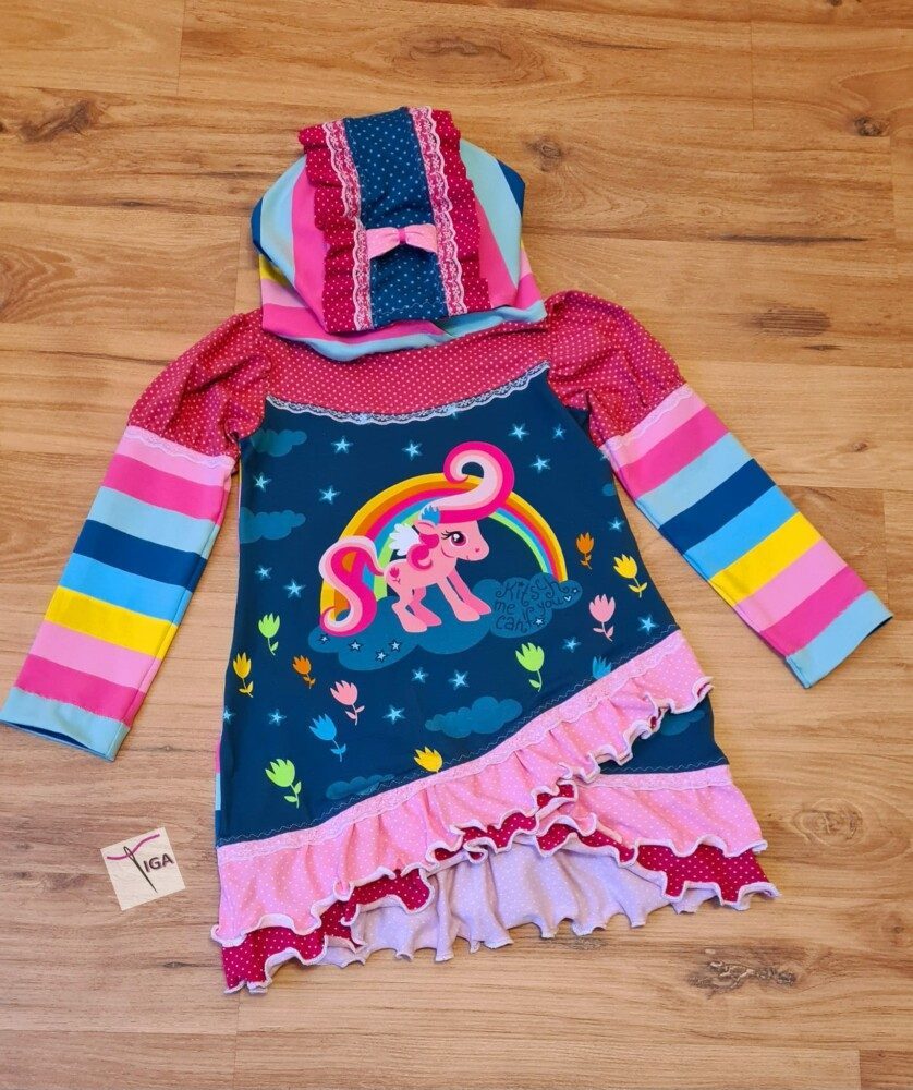 Wie so oft, ist Aya entstanden als ich online ein super süßes Panel entdeckt habe und sofort eine Idee dazu hatte. Der Schnitt war gleich vor meinem inneren Auge und ich wusste – jetzt wird´s rüschig :)! Aya ist perfekt geeignet für Mädels, die gerne etwas längere Oberteile tragen oder die Kombination aus Kurzkleid und Leggins mögen. Bei Aya hast du unglaublich großen Spielraum mit Knöpfen, Schleifen oder Spitzenborten einfach nur wundervolle Nähwerke entstehen zu lassen. Das Schnittmuster bietet dir einen asymmetrischen Abschluss mit einer etwas kürzeren Rüsche in zwei optionalen Längen. Möchtest du deine Aya lieber etwas länger haben, ergänzt du die asymmetrische Rüsche einfach um eine weitere Lage Rüschen mit geradem Abschluss! So entsteht ein toller Lagenlook der einfach nur prinzessinnenhaft verspielt wirkt! Besonders toll ist die Möglichkeit, hier auch Stofffarben und Muster zu kombinieren. Mit realtiv kleinem Aufwand, entsteht ein absolut aufwendig wirkendes Kurzkleid mit tollen Details! Wenn es mal schlichter sein darf, hat Aya auch hier eine prima Variante im Gepäck! Das Schnittmuster kann auch als etwas länger ausfallendes, ballonartig abschließendes Oberteil genäht werden! Mit Kapuze entsteht aus Aya ein Hoodie – mit Halsbündchen ein süßer Pulli! Apropo Kapuze- Aya bringt neben ihrem aufregenden Abschluss, eine Kapuze mit Steg und optionalen Rüschen mit. Ebenfalls enthalten ist ein normaler, langer und kurzer Ärmel für alle Jahreszeiten sowie ein geteilter Prinzessinnenpuffärmel.