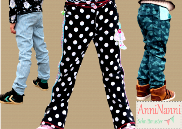 Es handelt sich hier um ein eBook für eine Kinderhose. Sie kann als Schlaghose oder als gerade Hose genäht werden. Die Hose wird nicht mit einem Bündchen genäht, sondern tatsächlich mit richtigen Hosenverschlüssen.