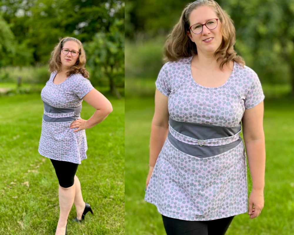 Arimoora kann als Tunika, Kleid oder Maxikleid genäht werden und bringt viele Optionen von einfachen bis aufwendigeren Umsetzungen mit. Das Schnittmuster benötigt etwas Aufmerksamkeit, da es stets beim ersten Nähen eine auf dich ausgerichtete Anpassung benötigt. Diese lässt sich schnell und einfach vornehmen mit den Hinweisen im Ebook, sodass deiner perfekten Arimoora nichts mehr im Wege steht und du dich mit den Varianten des Schnittes wunderbar austoben kannst. Der Schnitt bringt grundsätzlich ein Raglanoberteil mit Biesenoptik mit, hat ein gerafftes Rockteil oder ein weites A-Linienrockteil zur Verfügung und kann mit verschiedenen Ärmeln sowie einer Bindevariante stets neu erfunden werden. Allen Varianten gemeinsam ist das Mittelteil, welches Spitz zuläuft. Optional kannst du dieses aber auch gemeinsam mit dem A-Linienrockteil zu- schneiden und erhältst damit eine Arimoora ohne Mittelteil, falls du hier keine Absetzung wünschst. Die Ärmel, die das Schnittmuster enthält sind Folgende: normaler Ärmel in kurz und lang, glockiger Ärmel mit optionaler Bandraffung, ein Volantärmel oder ein geraffter, weiter Ärmel. Ebenfalls enthalten ist die Anleitung zu einer Bindevariante, welche durch das Einfassen der Armausschnitte und des Halsausschnittes entsteht. Arimoora verfügt in all ihren Rockteillängen auch jeweils über eine Vokuhilaversion (Ausnahme Tunika). Das leicht gespreizte vordere Rockteil der A-Linienversion sorgt für Freiraum am Bauch und lässt das Rockteil in leichten Wellen seitlich abschließen.