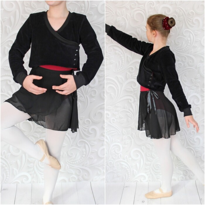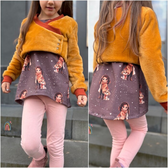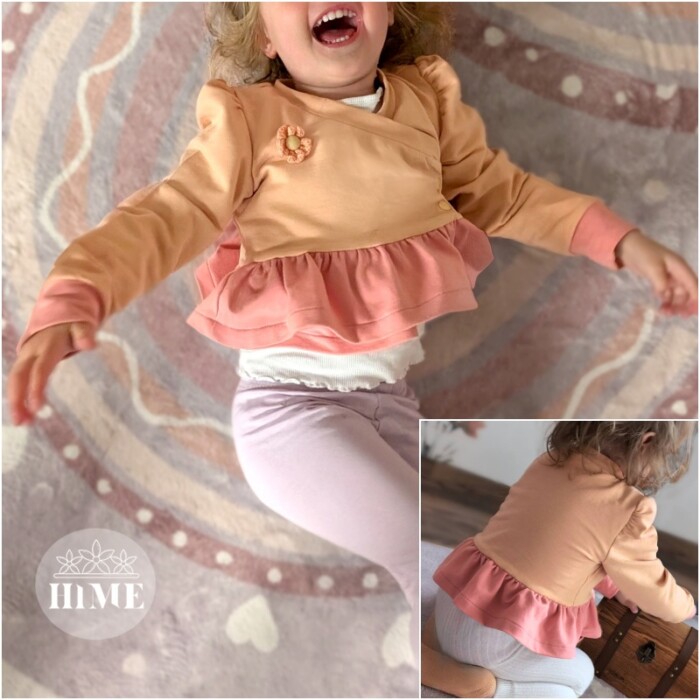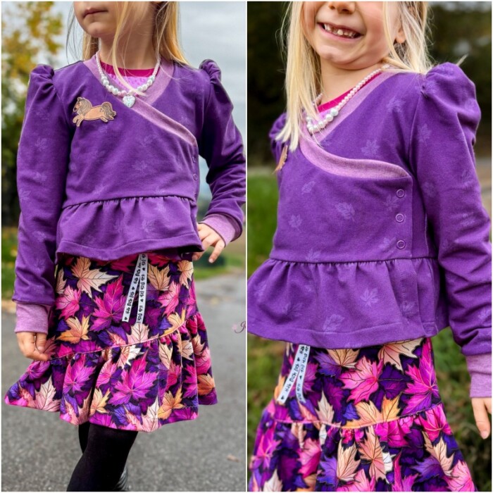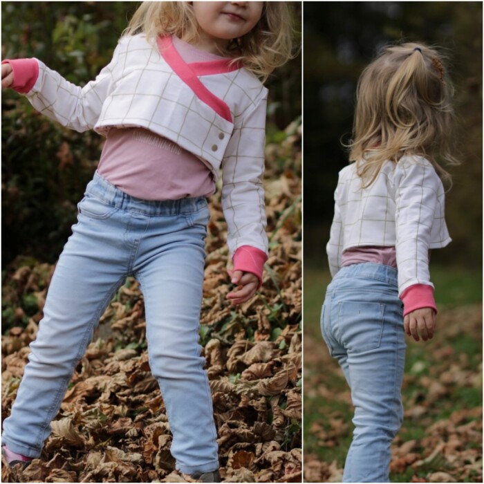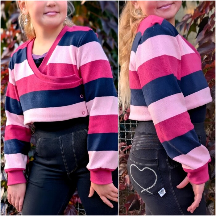 Beatrix ist nicht nur cool, sondern super praktisch. Der einfach genähte Bolero mit aufwendigem, hochwertigem Look ist perfekt geeignet um zu jeder Jahreszeit über andere Oberteile kombiniert zu werden. Seine an Vorder- und Rückteil doppellagige Nähweise sorgt für Wärme, während die einlagigen Ärmel genug Freiraum für die Ärmel des darunter getragenen Oberteils lassen. Der Schnitt lädt neben seinen Varianten auch zum Kombinieren verschiedener Stoffe ein. Empfohlen ist für die Außenlage ein etwas dickerer, dehnbarer Stoff wie etwa French Terry, Stretchcord, Stretchnicki oder diverse Strickstoffe, während die Innenlage aus Jersey genäht wird. Im Designnähen gab es aber z.B. auch ein Beispiel aus Lederjersey als Außenlage, das super cool aussah. Mit den Bündchen können Highlights gesetzt werden. Generell gibt es bei Beatrix zwei Längen- eine normale, kurze Länge sowie eine etwas längere Länge mit einer ergänzenden Abschlussrüsche. Der Bolero wird gewickelt getragen und verfügt im Inneren über ein zusätzliches, kleines Verschlussteil. Normale lange Ärmel oder Puffärmel sind weitere Möglichkeiten, die viele schöne Kombinationen entstehen lassen können.