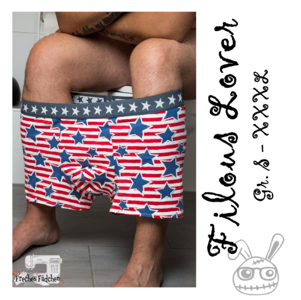 Filous Lover aka Sackgeflüster … die Retro-Boxer für´s männliche Wesen ;-) Nun kann die Filouserie (Wäscheserie) von Frau Ninchen vervollständigt werden und es können reihenweise Boxershorts für die Männer genäht werden. Filous Lover ist auf Figur geschnitten und es sollte deshalb bei der Stoffwahl auf ausreichend Elasthan geachtet werden. Die Boxer sitzt knapp über der Hüfte und hat ein verhältnissmäßig kurzes Bein.