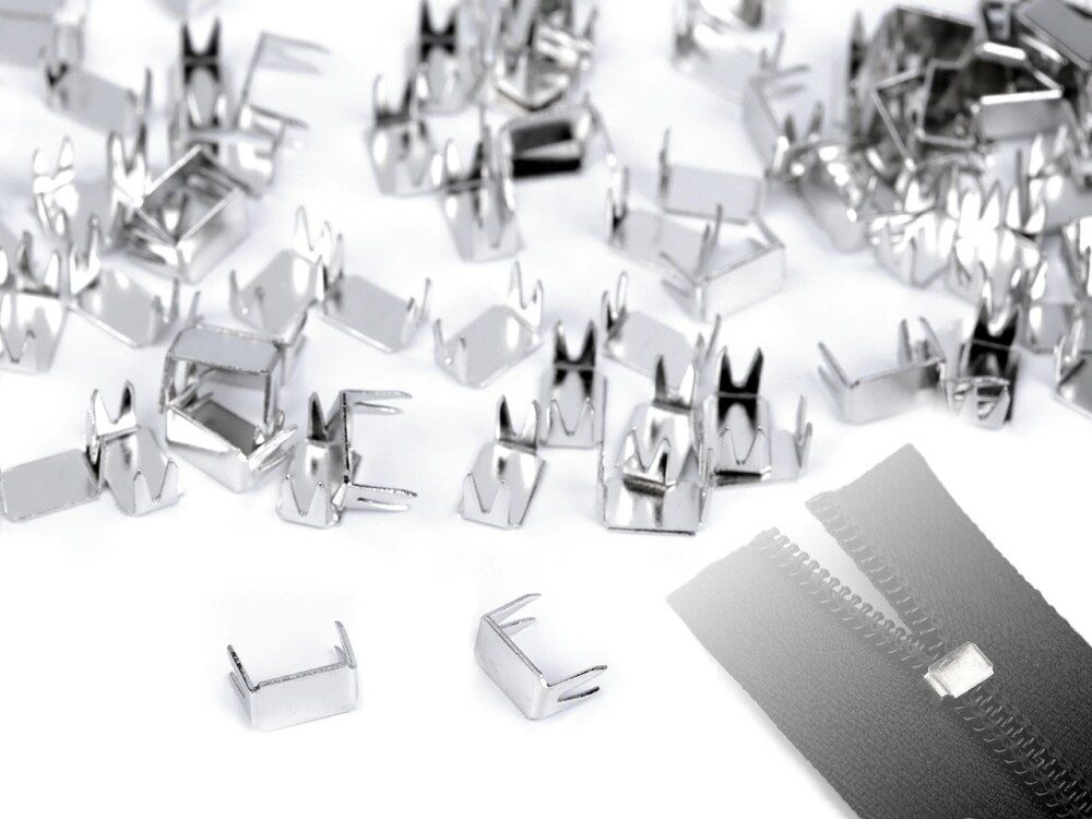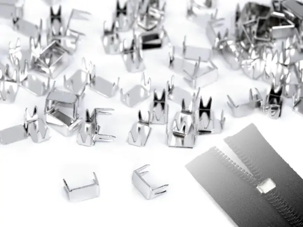 Dieses Endstück dient zum Verschließen von Reißverschlüssen, so dass der Zipper nicht rausrutscht. Er ist leicht zu befestigen – es reicht nur, die Zähnchen mit Hilfen von einer Zange am Rande des Reißverschlusses zuzudrücken.
