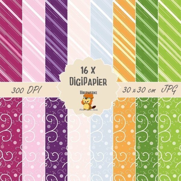 Das Set besteht aus 16 verschiedenen Papieren im Format 30x30cm mit 300 DPI Auflösung. Dateiformat ist JPG.