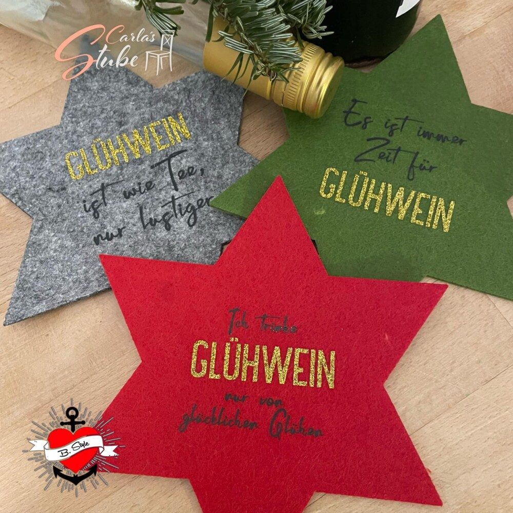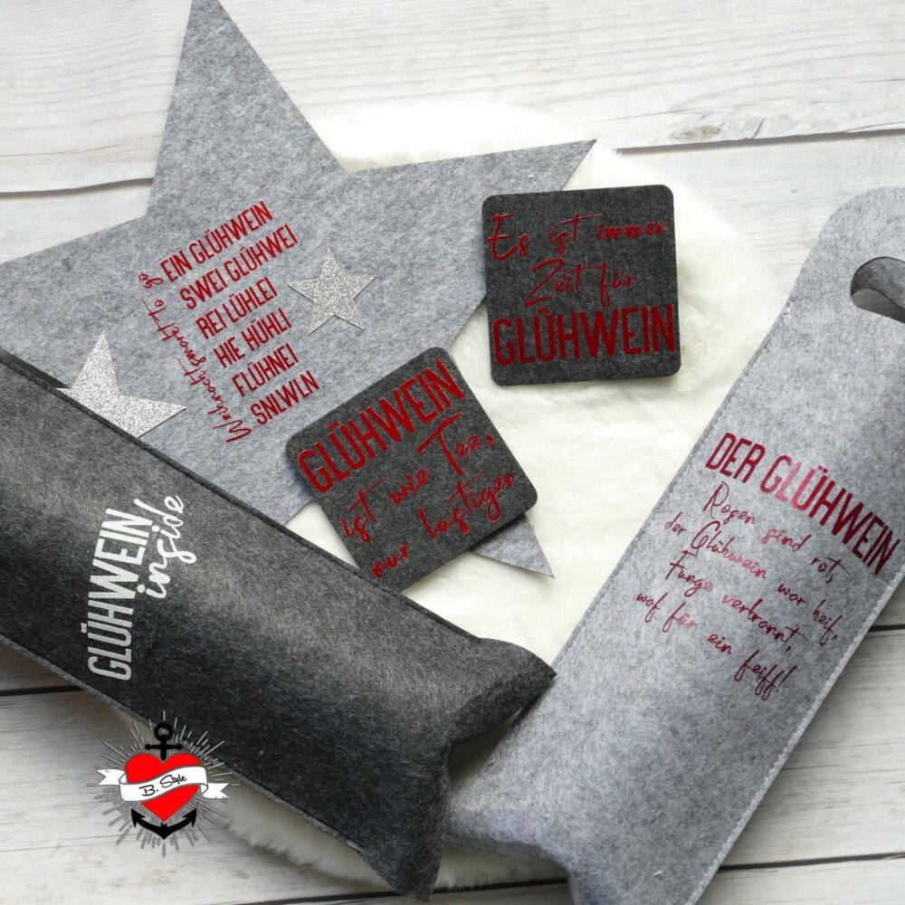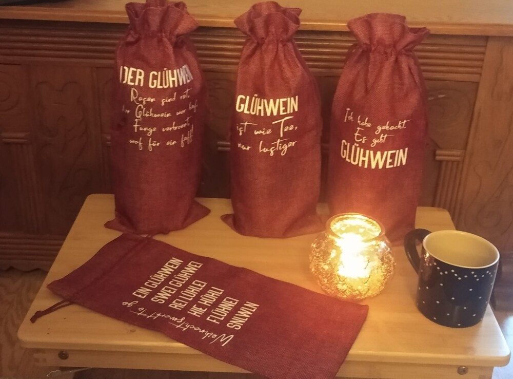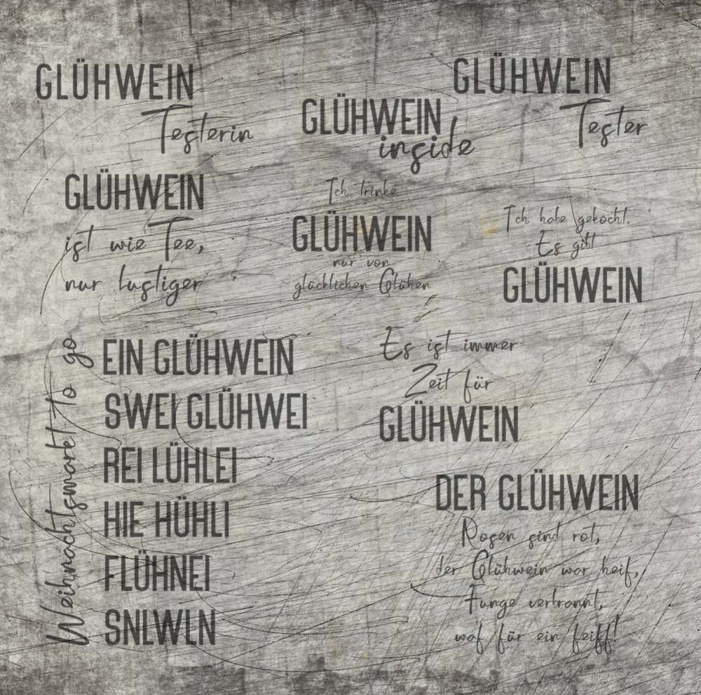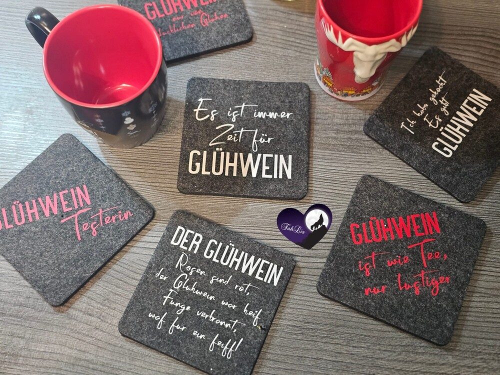 * Glühwein Tester/in, Glühwein ist wie Tee, nur lustiger, Glühwein inside, Ich trinken Glühwein nur von glücklichen Glühen, Es ist immer Zeit für Glühwein, Ich habe gekocht. Es gibt Glühwein, Der Glühwein Rosen sind rot, der Glühwein war heif, Funge verbrannt, waf für ein feiff!, Weihnachtsmarkt to go Ein Glühwein swei Glühwei Rei Lühlei Hie Hühli Flühnei Snlwln