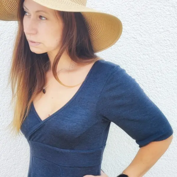Durch die Kreuzung an der Brust eignet sich der Schnitt ausgezeichnet zum Stillen. Das breite Gummiband unter der Brust sorgt für den perfekten Halt. Auch ein Babybauch passt exzellent in dieses Kleid- oder Shirt-Schnittmuster – hierfür empfiehlt es sich das Unterbrustband in der Höhe zu halbieren.