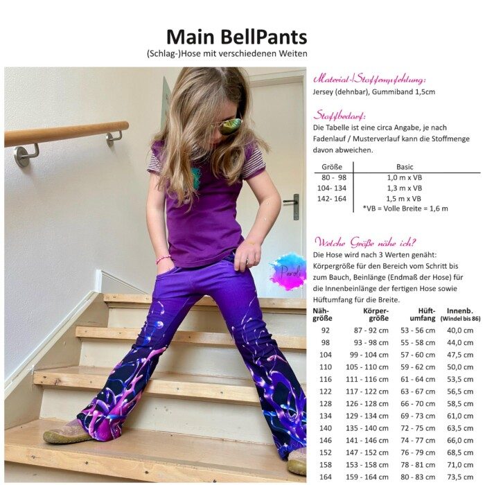 Die Main BellPants ist eine schmal geschnittene Hose mit leichtem oder weiterem Schlag an den Hosenbeinen und passend für den coolen, modernen Kleidungsstil von jungen Mädchen. Sie wird aus dehnbaren Stoffen wie Jersey genäht und gibt den Kids damit auch genügend Bewegungsfreiheit und Bequemlichkeit bei alle Aktivitäten. Optional kann sie mit Teilungsstreifen und Eingriffstaschen genäht werden.