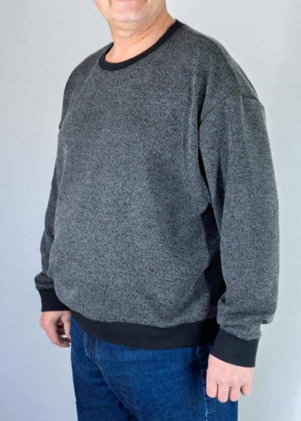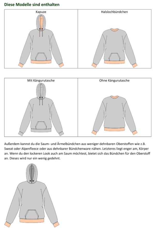• Plüsch für erfahrene Näher*innen, die einen besonders weichen Kuschelpullover kreieren möchten.Für einen sportlichen Look kannst du eine Kängurutasche auf das Vorderteil nähen. Die Saumbündchen lassen sich entweder aus dem Hauptstoff oder aus dehnbarer Bündchen- bzw. Jerseyware anfertigen.