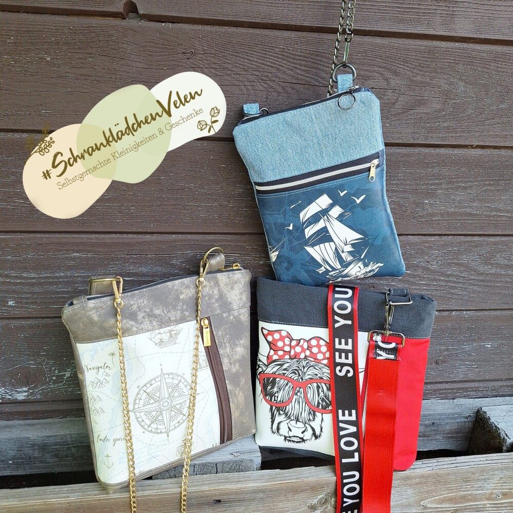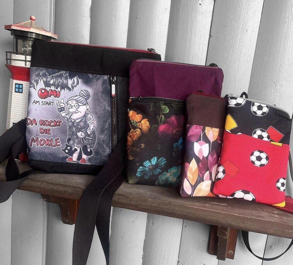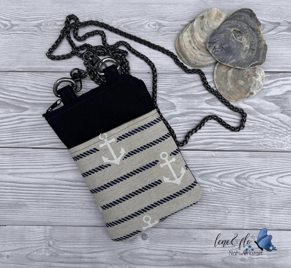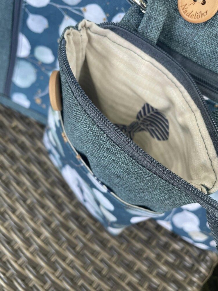 ‚Dorschje‘ ist kleiner und trägt daher lediglich ein paar Kleinigkeiten mit sich rum. Mit ca 23 x 17 cm (HxB) reicht der Platz aber locker für ein großes Smartphone, ein kleines Portemonnaie und die wichtigsten Schlüssel.