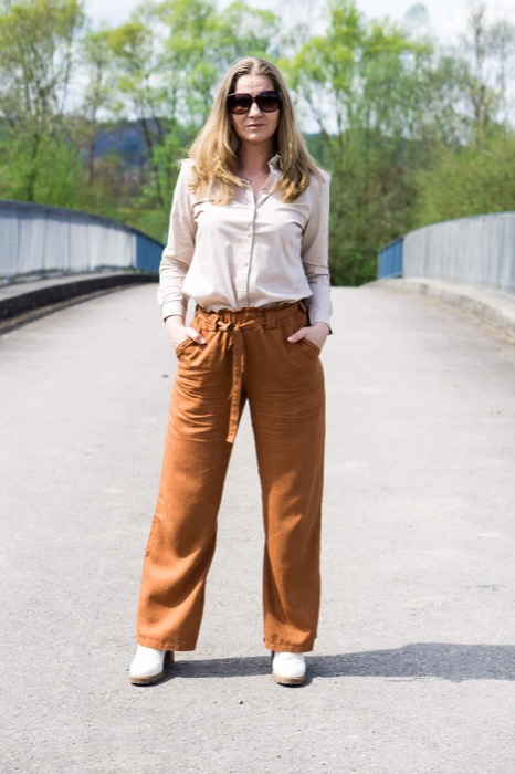 Weich fallende und fließende Stoffe wie Viskose, Crépe, Musselin oder leichte Leinen eignen sich besonders. Dieses Schnittmuster ist einfach zu nähen und auch für Anfänger:innen gut geeignet.