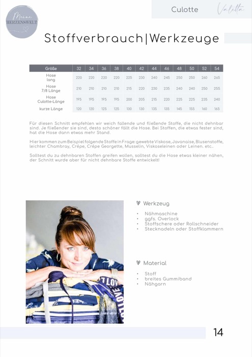 Mit dem Schnittmuster „Valetta“ von Meine Herzenswelt gestaltest du eine vielseitige Culotte für jeden Anlass. Ob kurz, 3/4, 7/8 oder lang – passe die Länge an deinen Stil an und kreiere ein individuelles, bequemes Kleidungsstück für Alltag, Urlaub oder besondere Anlässe.