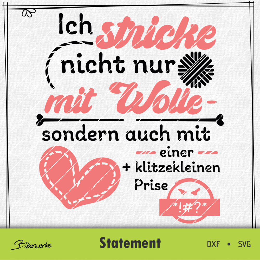 💬✨ Diese Plotterdatei ist ein liebevoller Spruch für alle, die beim Stricken nicht nur Wolle, sondern auch Herzblut (und gelegentlich ein Fluchwort 😅) einbringen. Die Datei ist perfekt für Shirts, Tassen oder auch Beutel geeignet. 😉