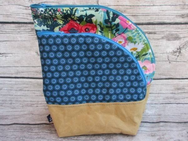 Unter dem Reißverschluss wird eine Blende eingenäht, die verhindert, dass sich die Wolle verhakt. Außerdem kann innen eine Tasche z.B. für Rundstricknadeln eingenäht werden.