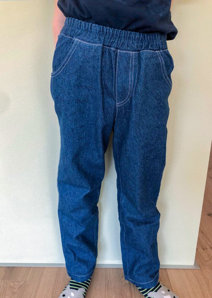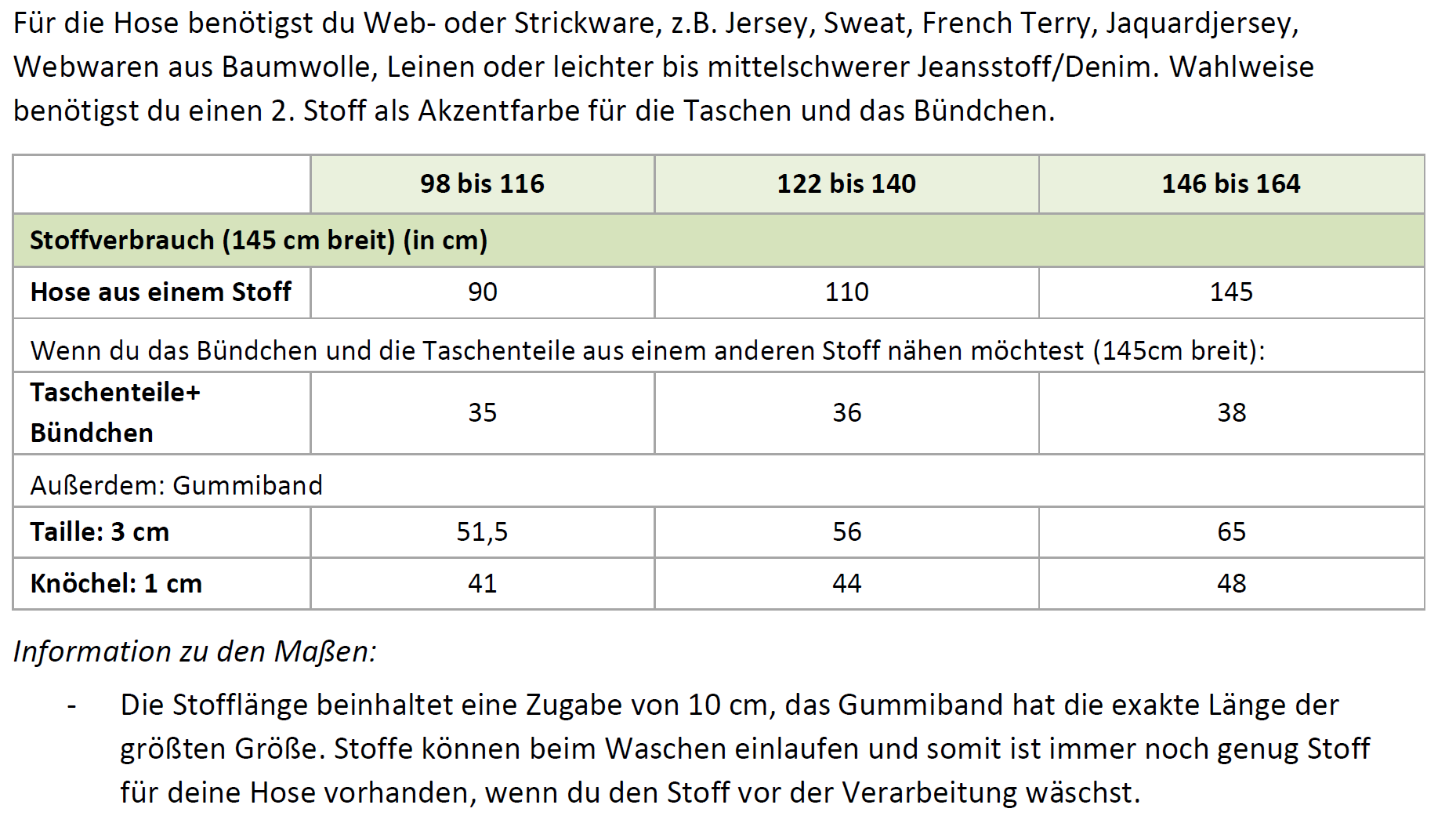 Aber das ist noch nicht alles! Neben den Einzel- und Mehrgrößenschnitten von Größe 98 bis 164 enthält das Schnittmuster eine kleine Einführung zum Nähen von Jersey und hilfreiche Tipps für das Nähen von Jeansstoff. Damit bist du bestens gerüstet, um die Hose aus Jersey oder Jeansmaterial zu verwirklichen. Die Kinderhose ist locker geschnitten und für Kinder ohne Windelpo geeignet. Die allgemeinen Nahtzugaben liegen bei 0,7 cm. So kannst du die Hose auch ganz leicht mit der Overlock nähen, wenn du z.B. einen Sweat oder Jersey für dein Projekt nutzt.