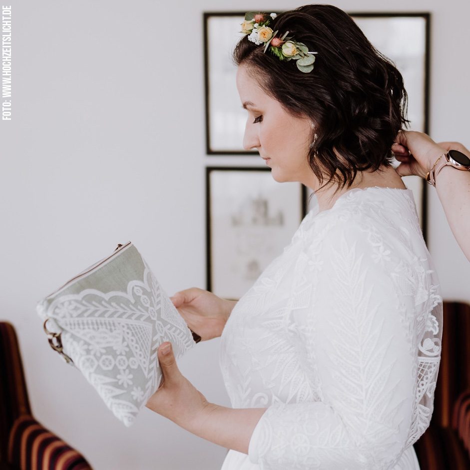 Die große Clutch wurde so konzipiert, dass alles Nötige für den Hochzeitstag oder Partyabend hineinpasst – sogar ein großes Smartphone passt hochkant hinein. Dazu noch eine Mini Mynta Geldbörse, eine Packung Taschentücher, etwas Kleinkram und schon bist du ausgehfertig.
