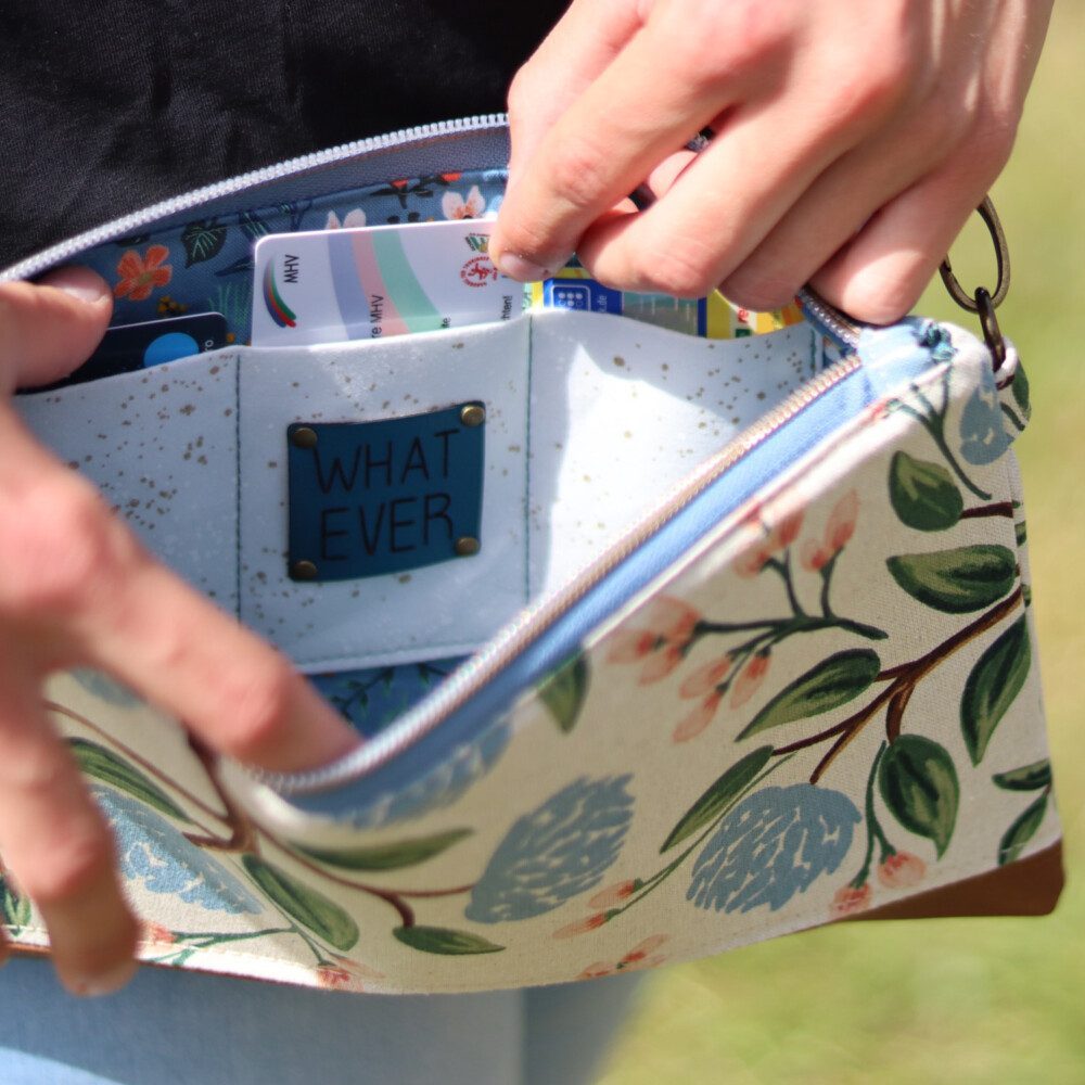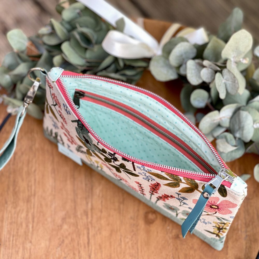 Verschlossen wird diese Tasche mit einem Reißverschluss, sodass alles sicher verwahrt ist. Ich zeige dir, wie du die Enden am Reißverschluss schön sauber und ohne „Knubbel“ einfassen kannst. Bei der Handgelenksschlaufe kannst du aus vier verschiedenen Varianten wählen. Du kannst sie entweder selber nähen oder Gurtband bzw. Lederriemen verwenden.